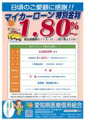 | ◆マイカーローン「クイック」 ◎金額:2千万円まで ◎期間:15年以内 完済時年齢 満80歳まで ◎金利:年1.8%~ |