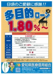| ◆多目的ローン(事業資金を除く) ◎資金使途:マイカー、教育以外の 資金使途が明確なもの ◎金額:2千万円まで ◎期間:10年以内 15年以内(リフォーム資金) 完済時年齢 満80歳まで ◎金利:年1.8%~ |